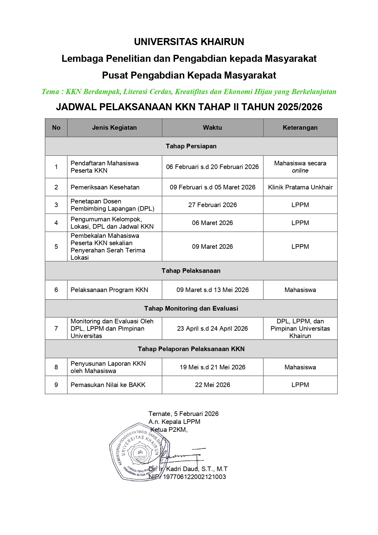 JADWAL PELAKSANAAN KKN TAHAP II TAHUN 2025/2026